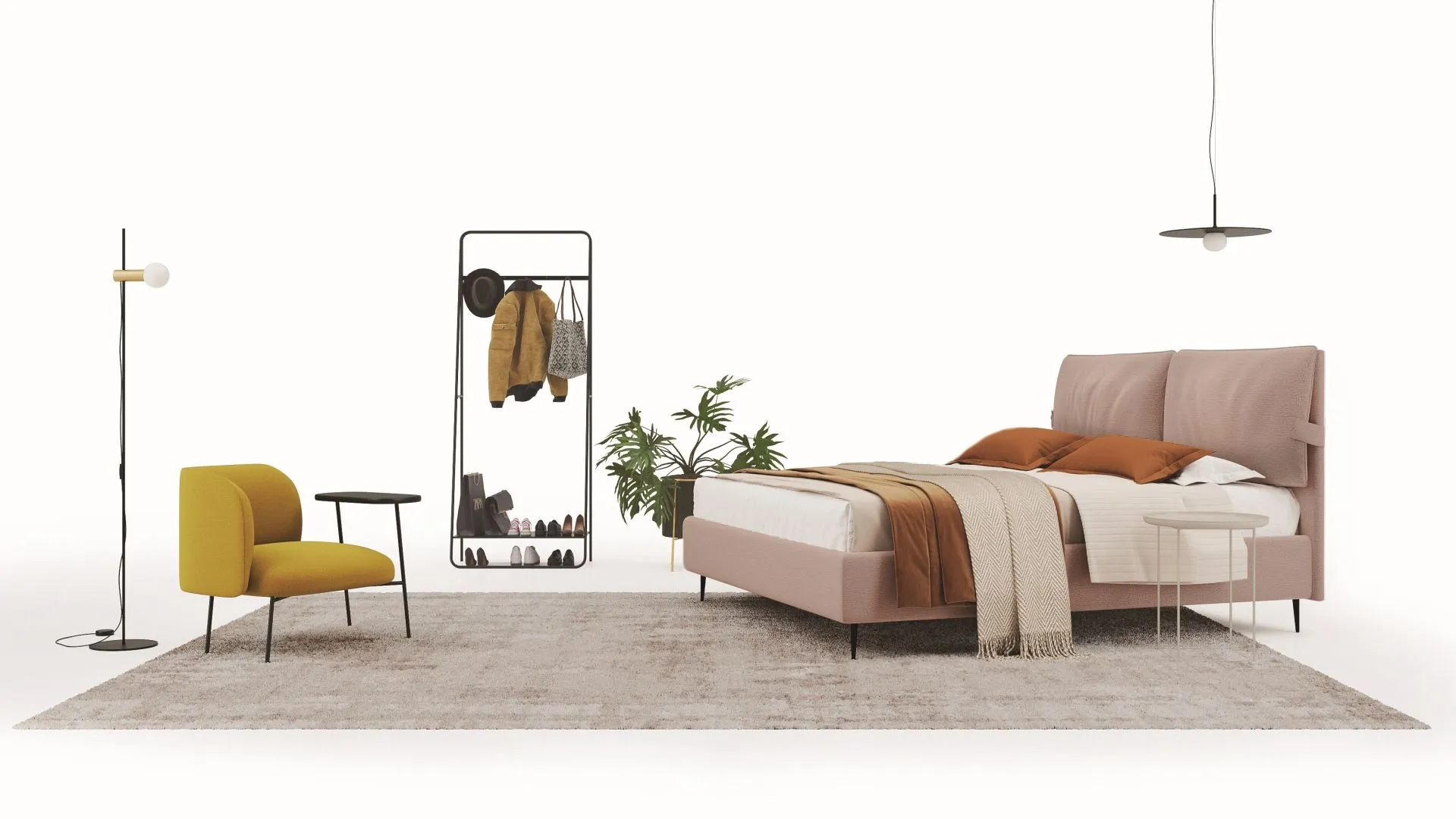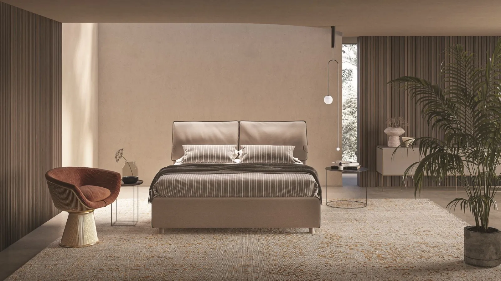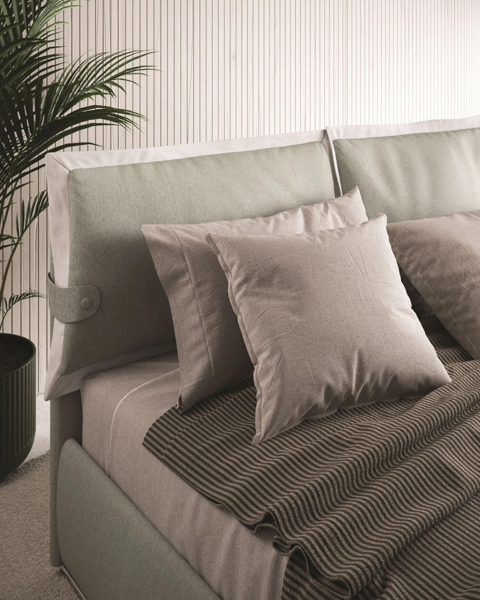 Elegant modern bed with practical storage box, padded and covered in fabric. The high headboard is available in four exclusive variants to choose according to your comfort and style needs.