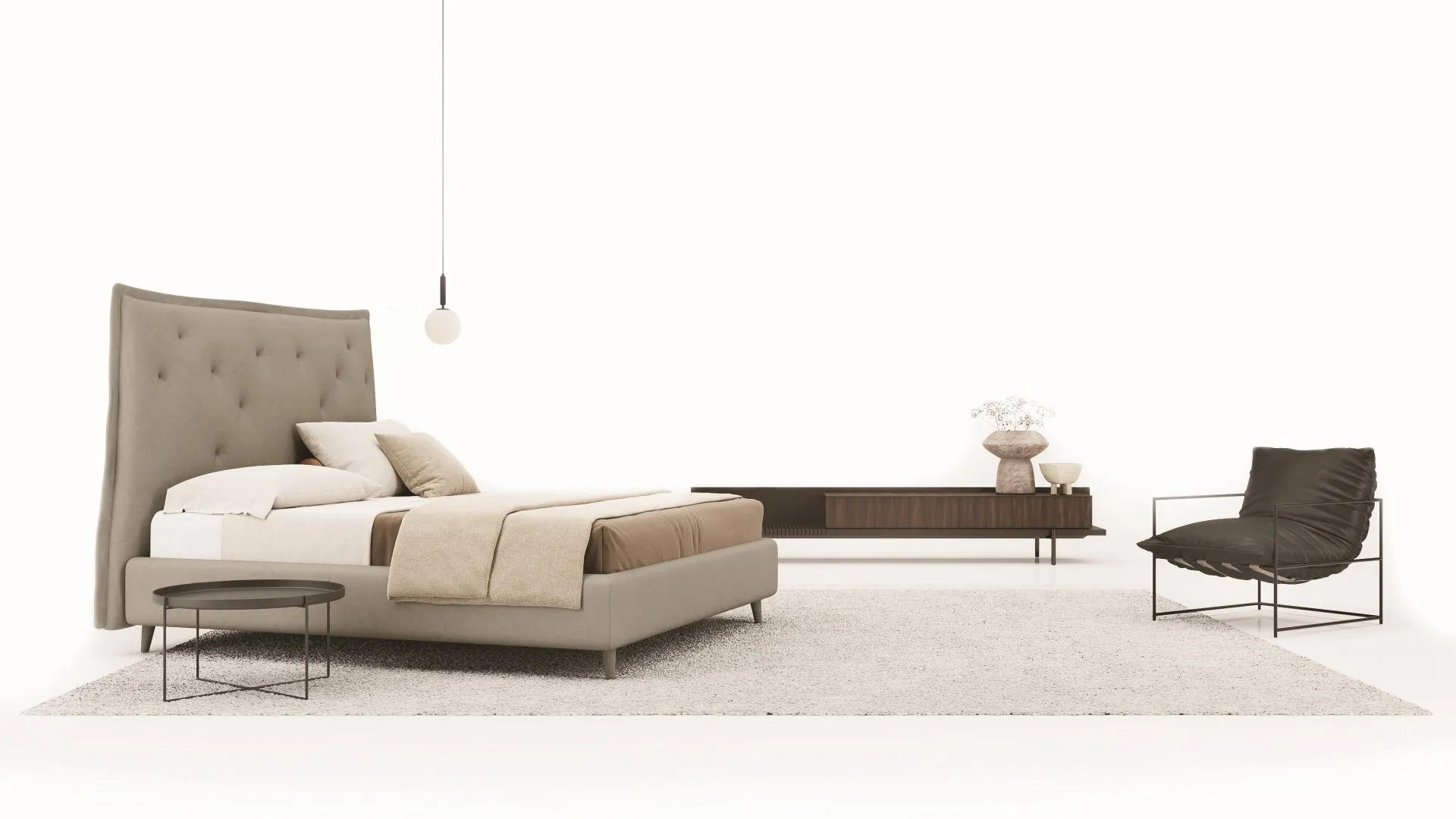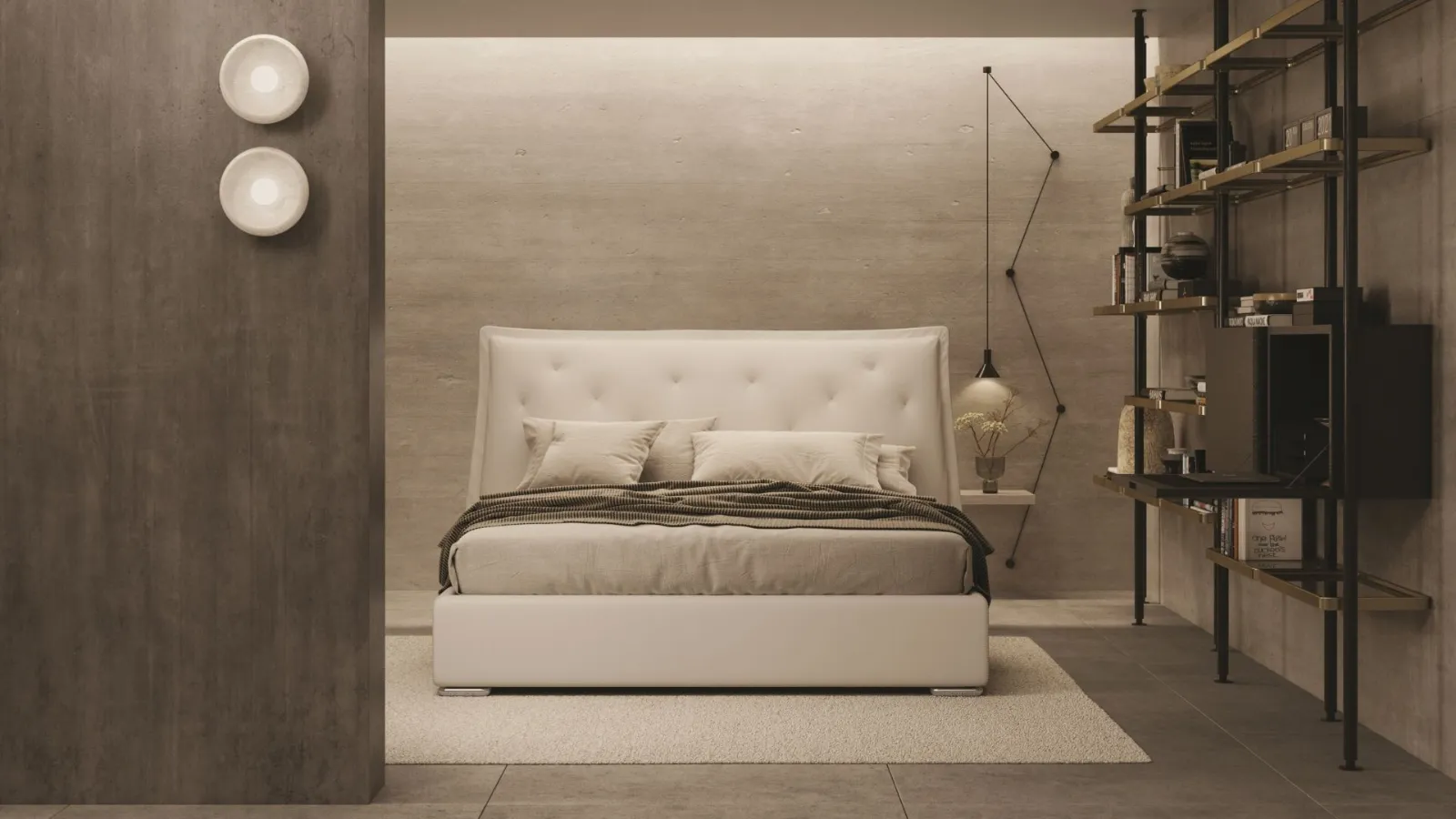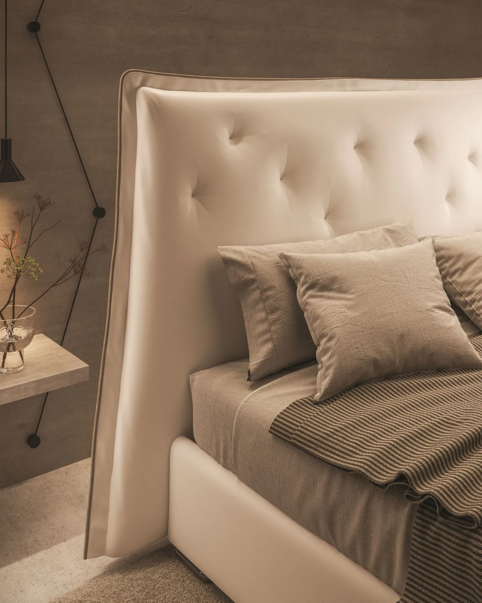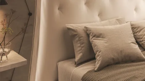 Discover our upholstered double beds with quilted headboard: classic line and ruffles with blanket stitching also on the bed frame. An attentive eye also to daily practicality with the convenient storage box.