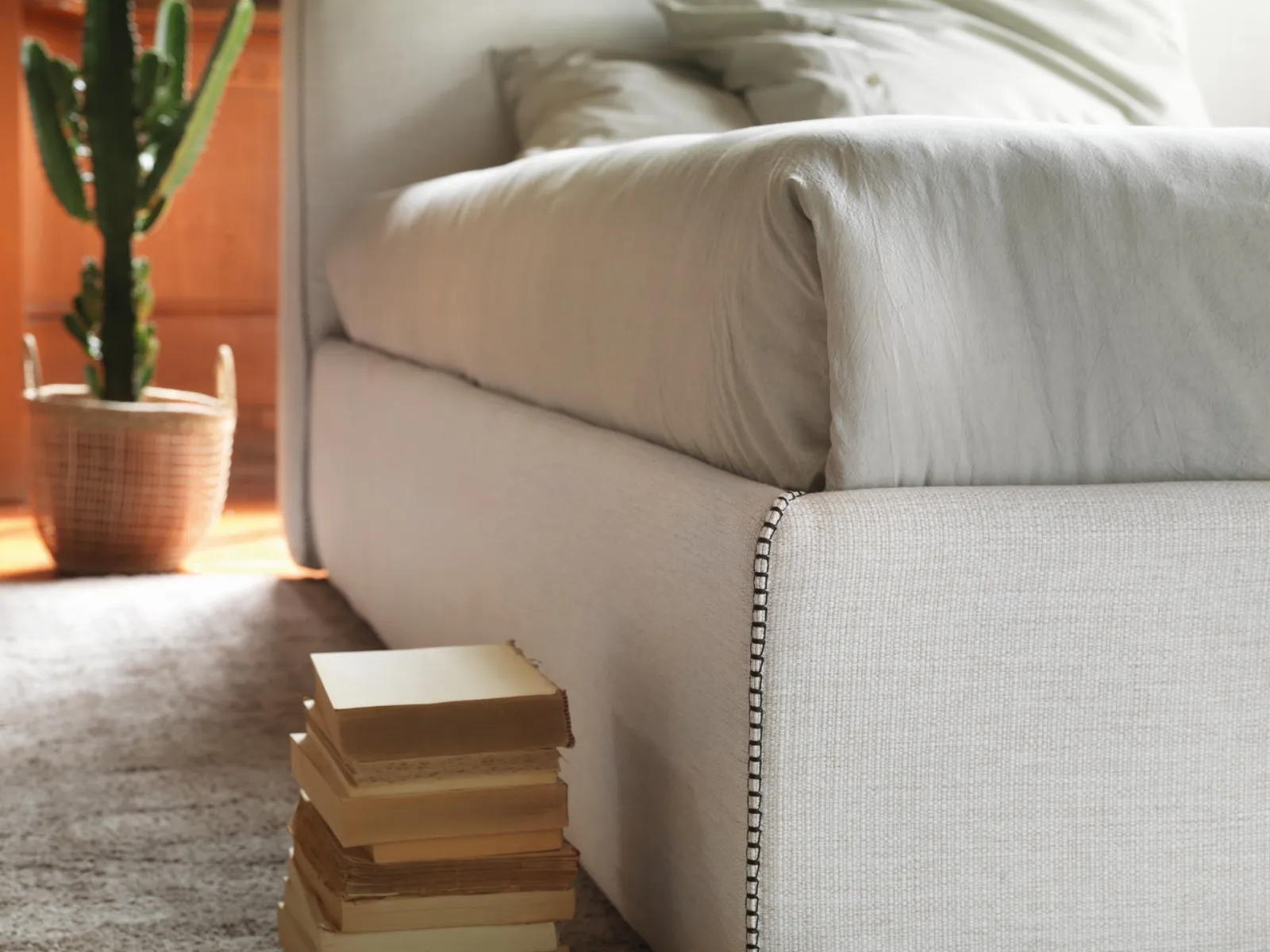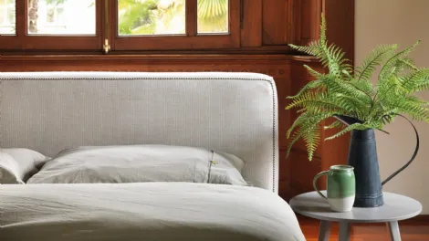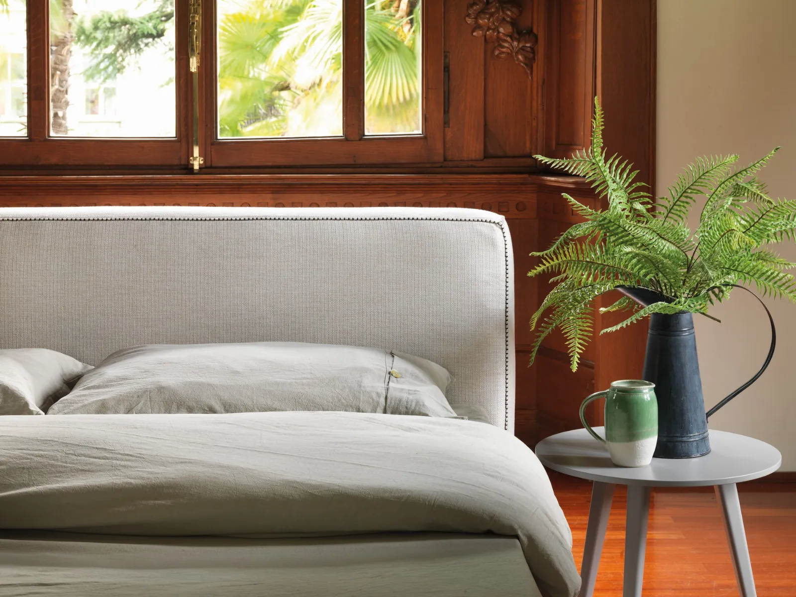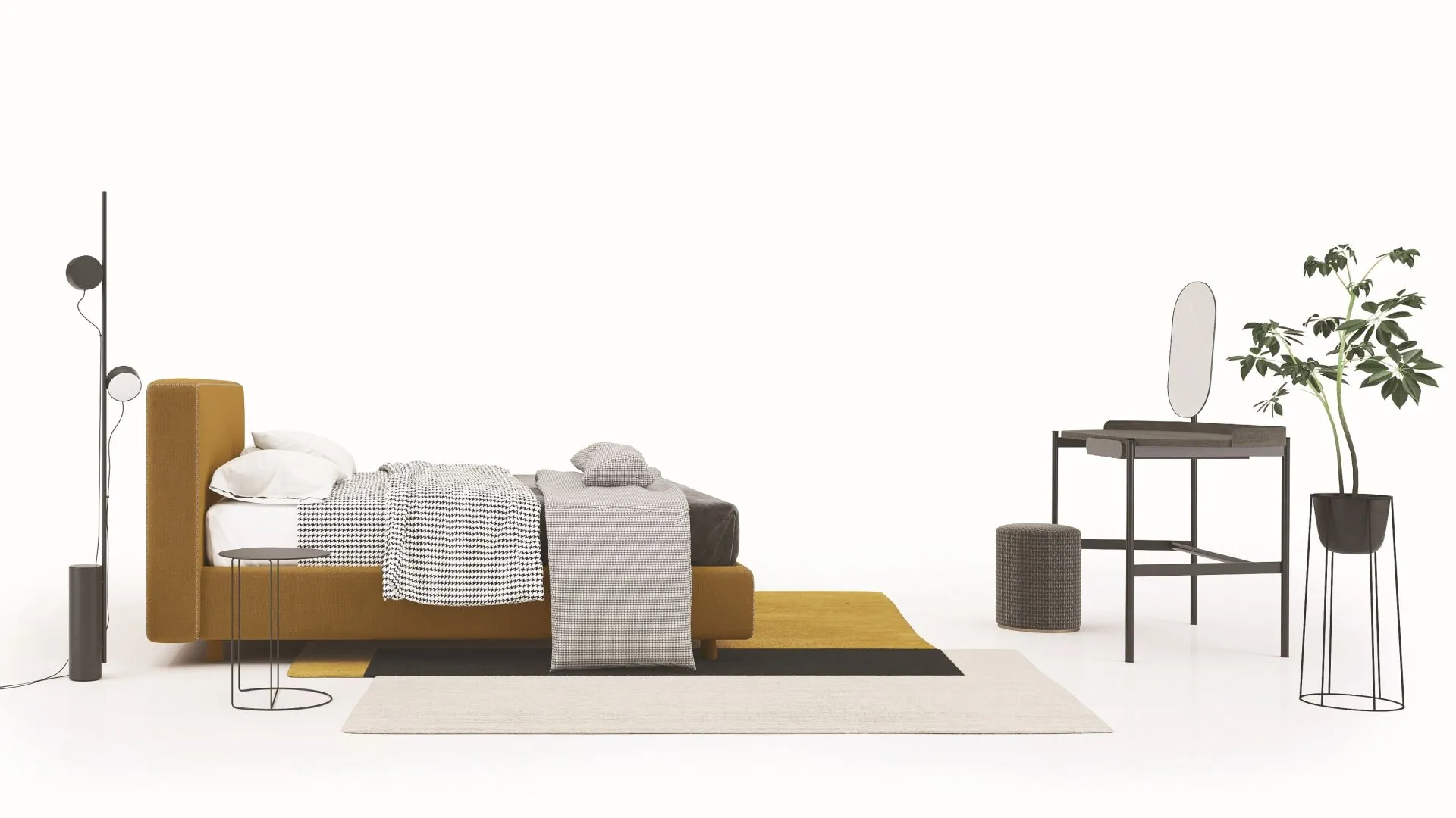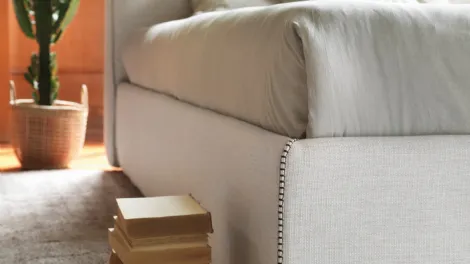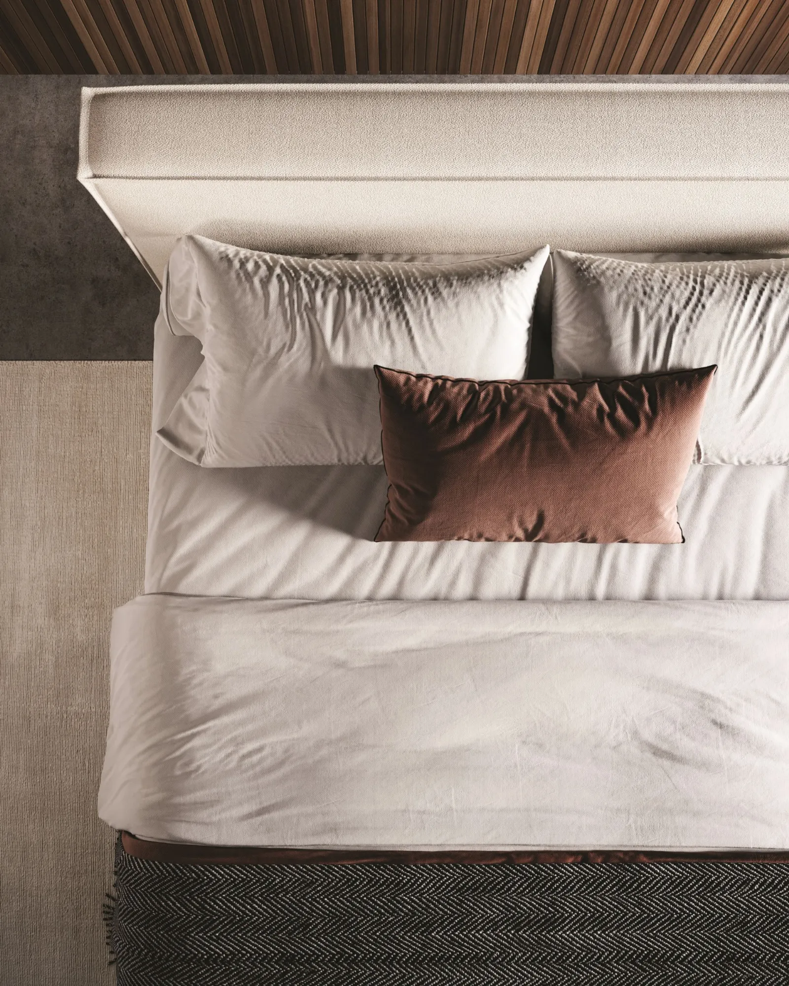 Upholstered double bed with a sober and linear design that encompasses all the Italian tailoring always attentive to the quality of materials and design.