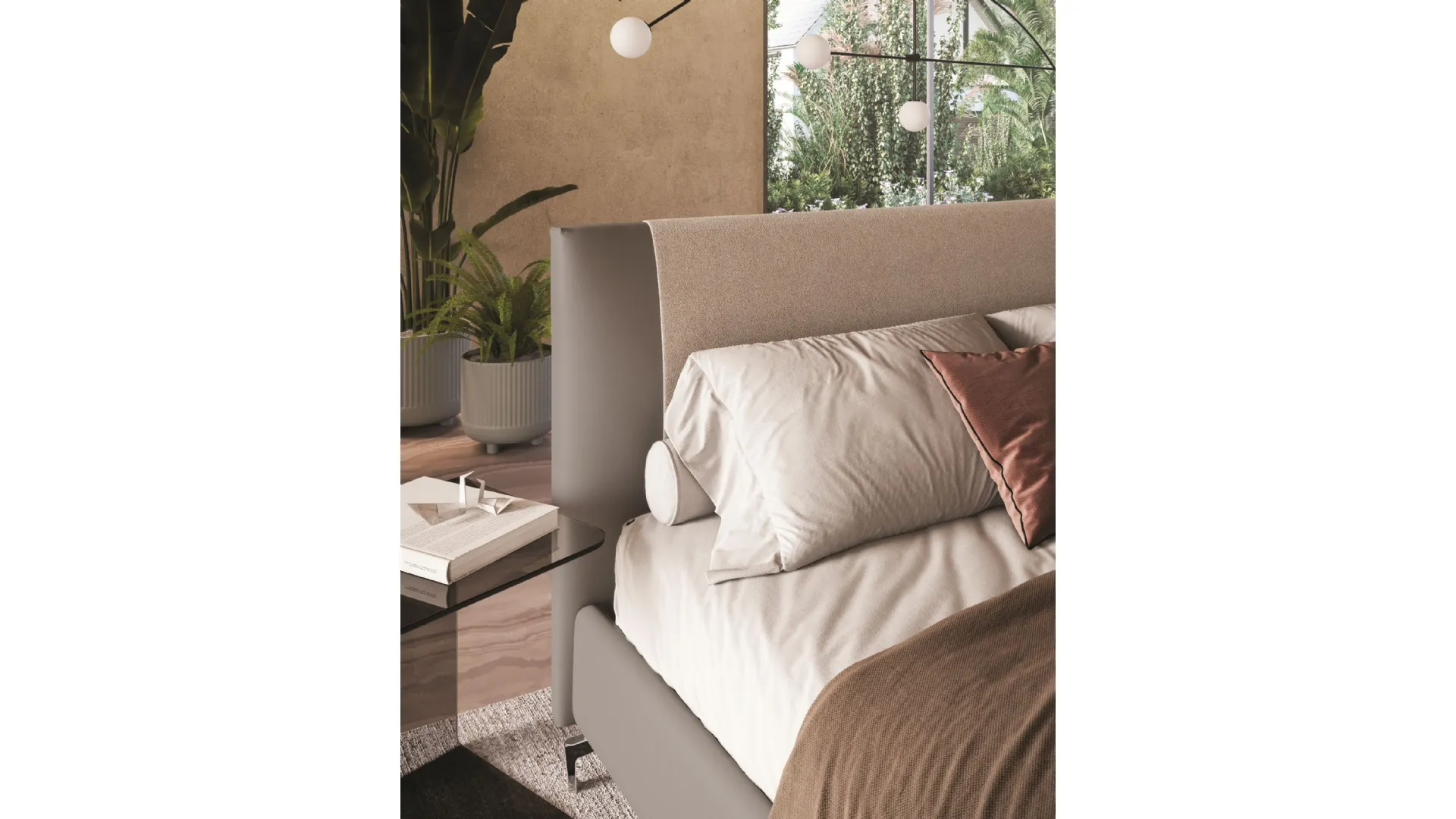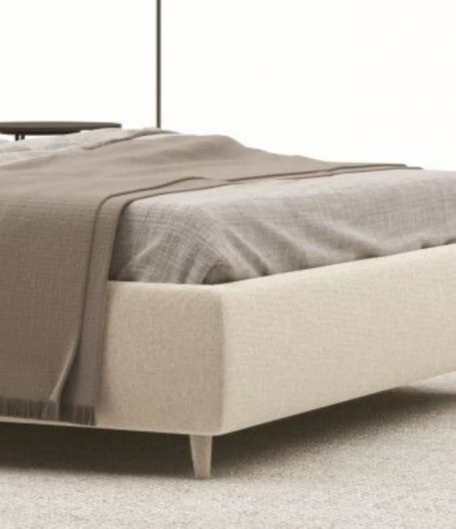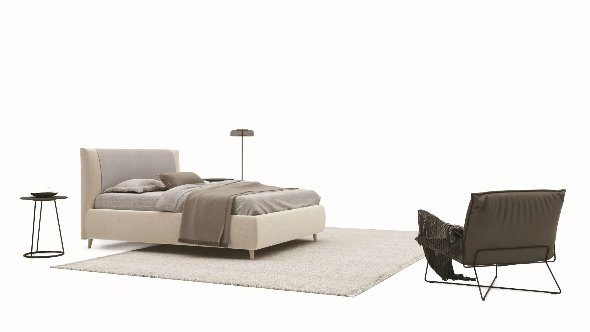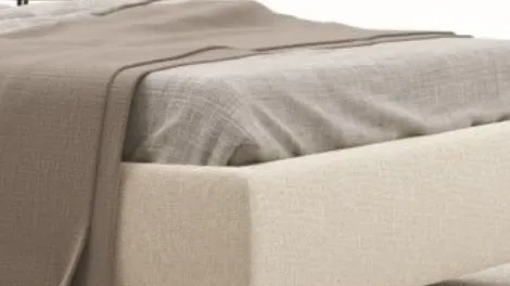 Bed with upholstered headboard and bed frame available in various versions of bed frame and feet, also with bed skirt.