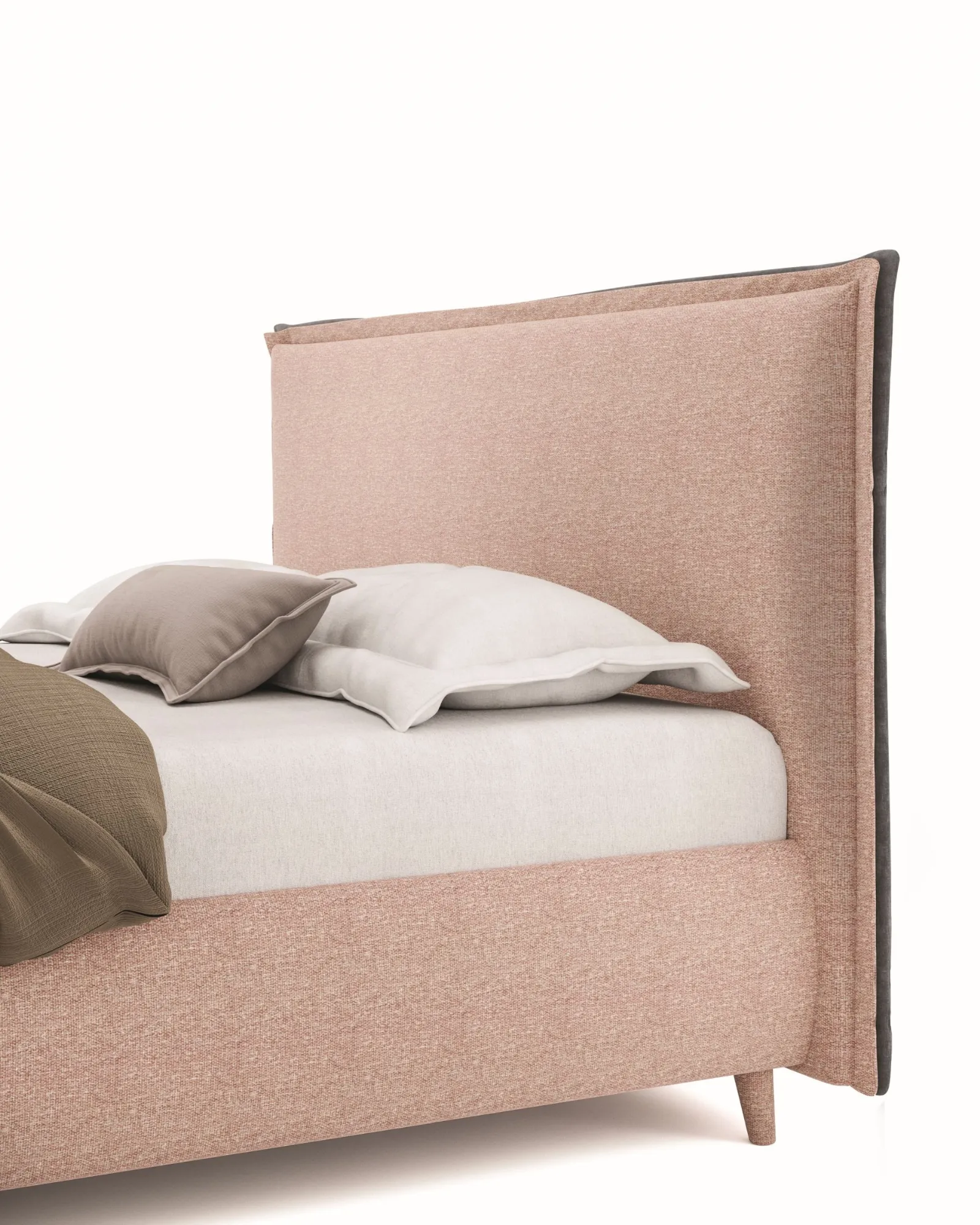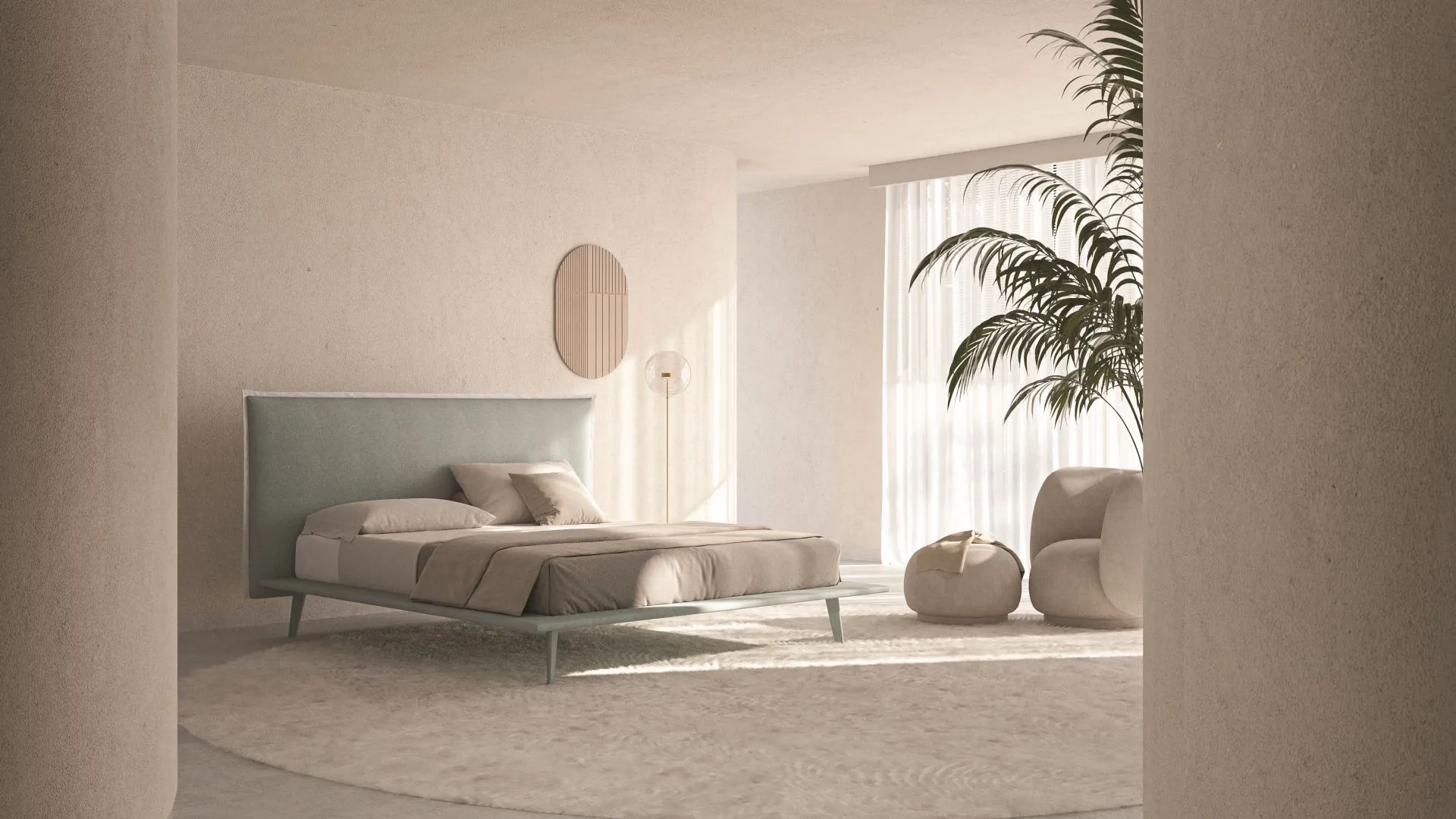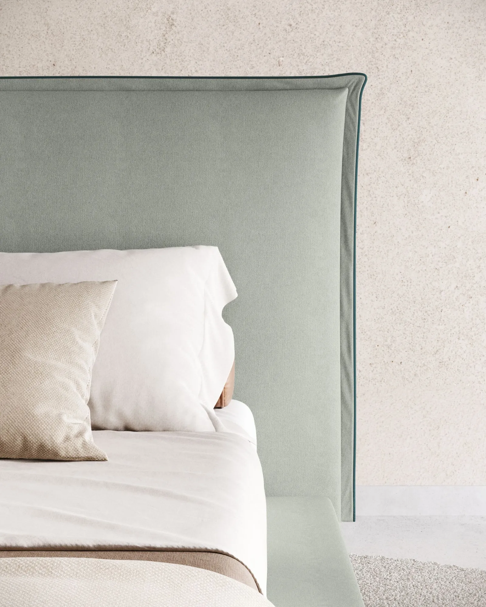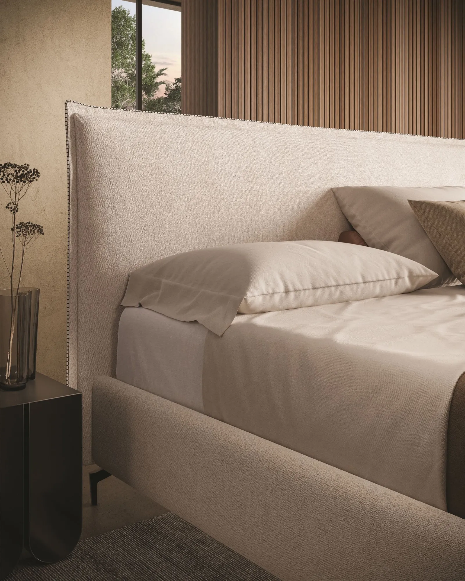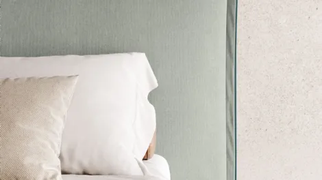 Bed with a romantic line thanks to the sober frills on the headboard, but with a modern and clean design thanks to which the evocation of past times takes on a graceful connotation.