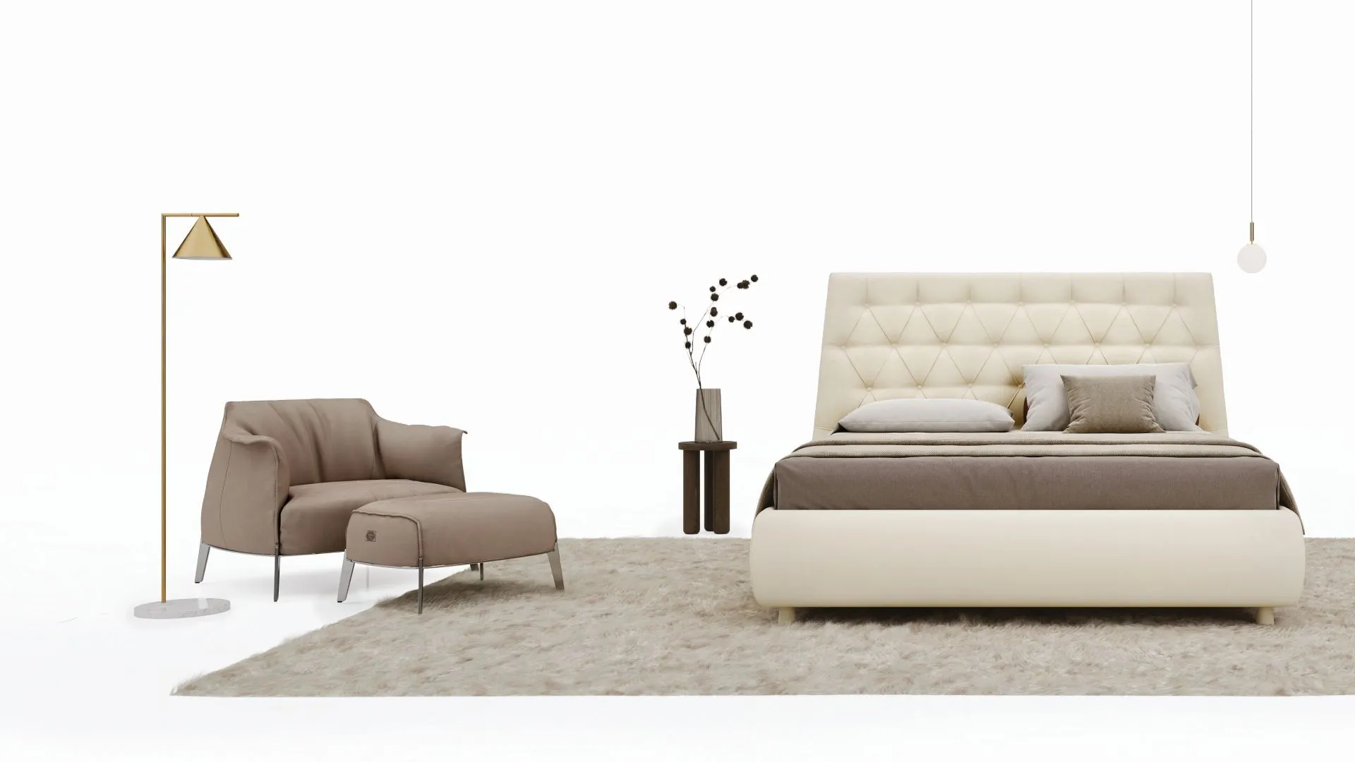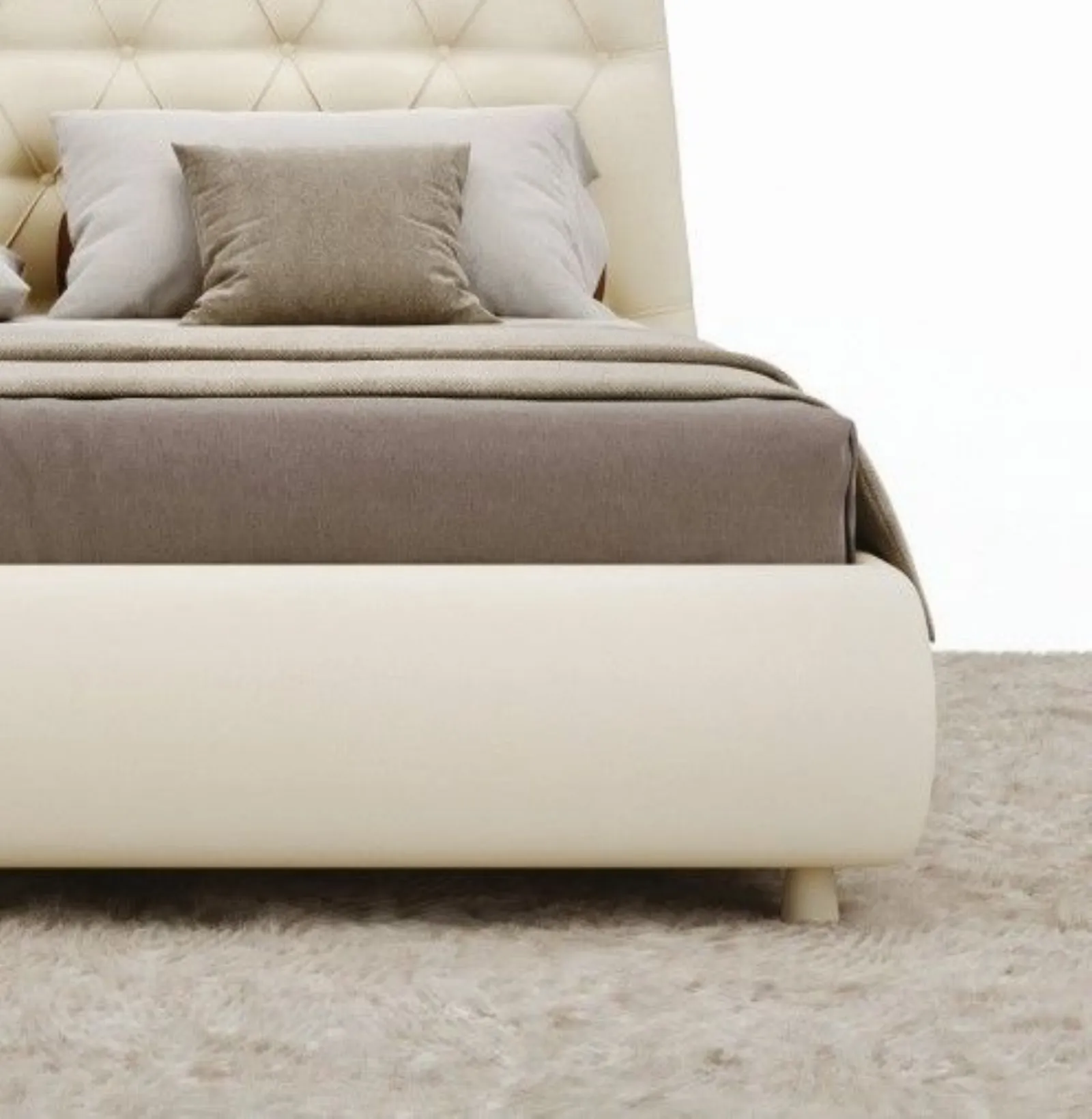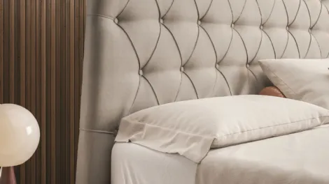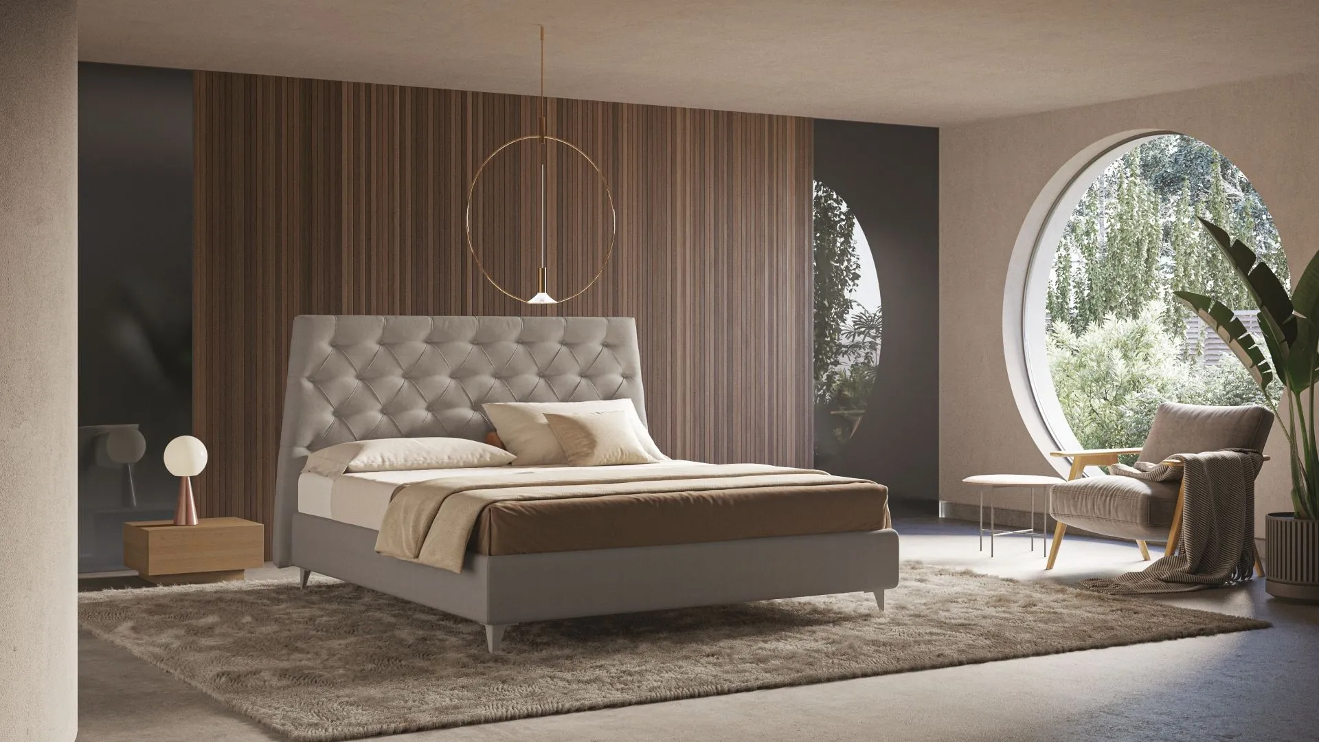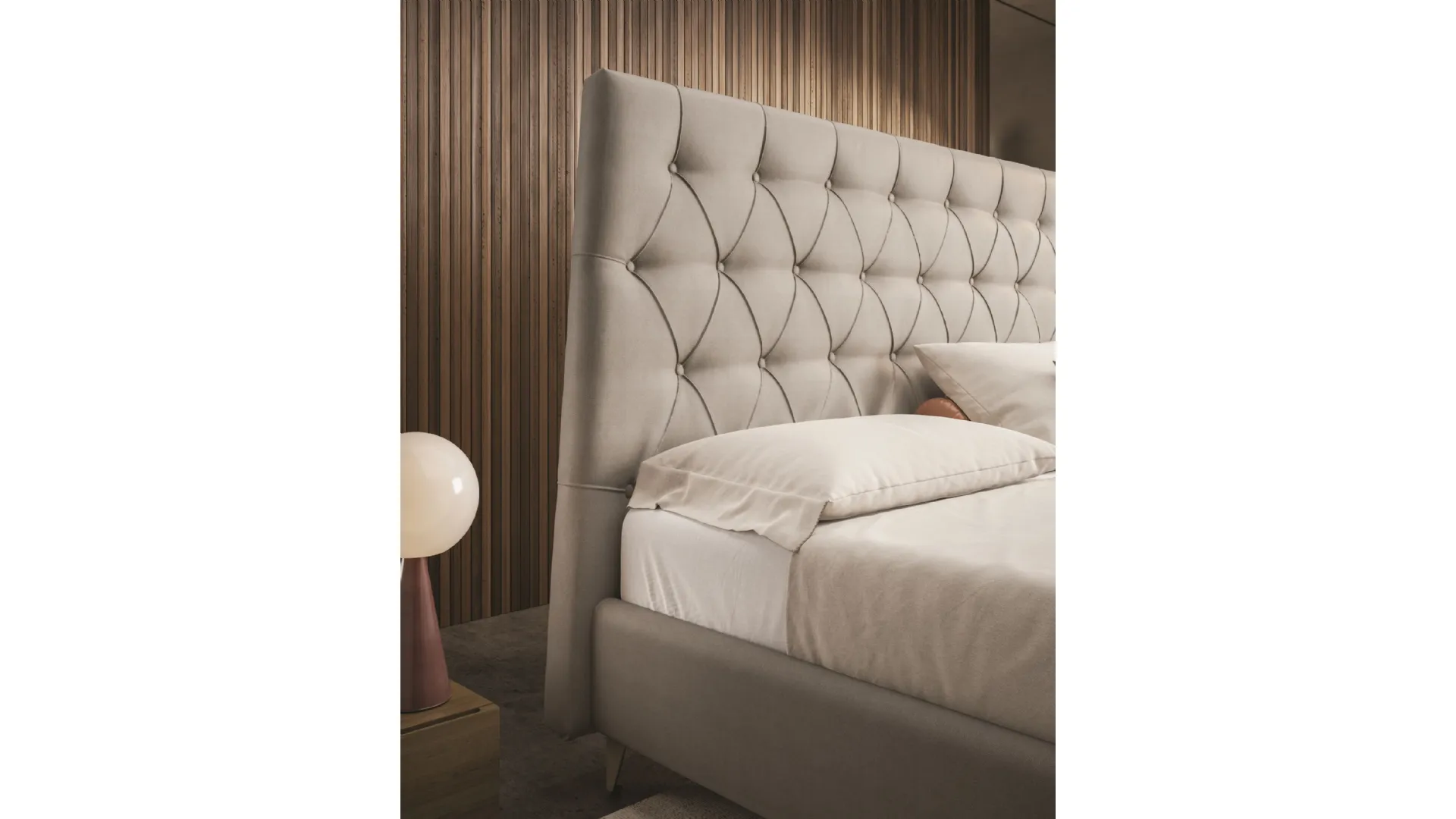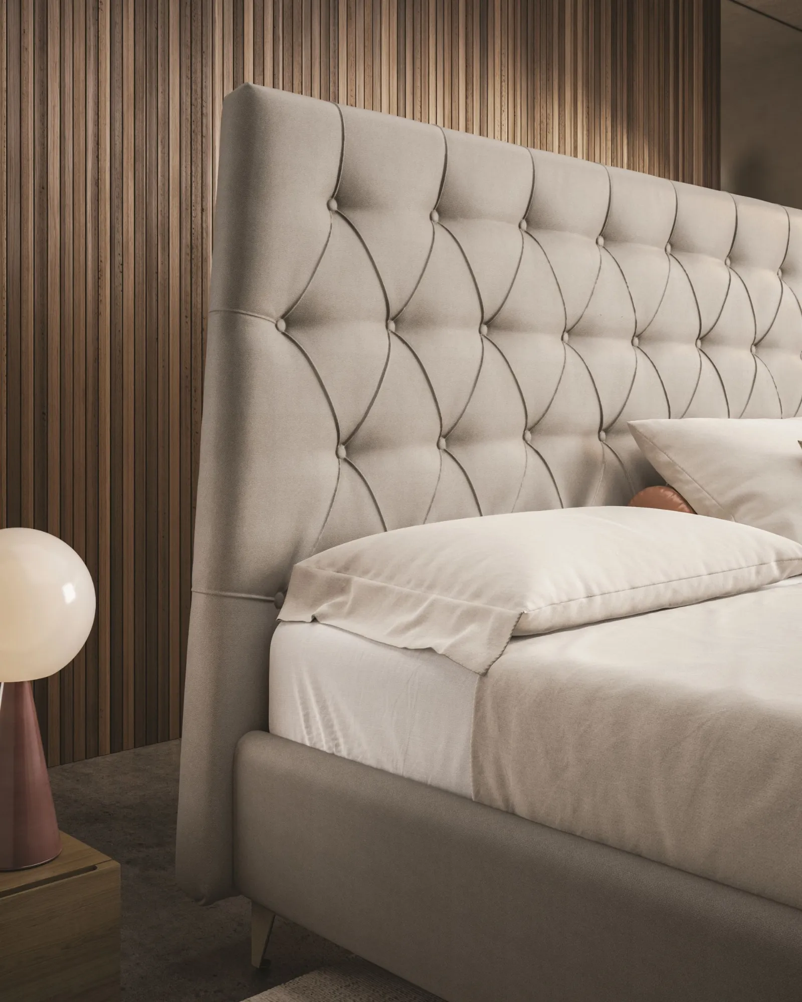 Upholstered double bed with high or low bed frame. The elegant tufted headboard gives a touch of class to any context of style and taste.