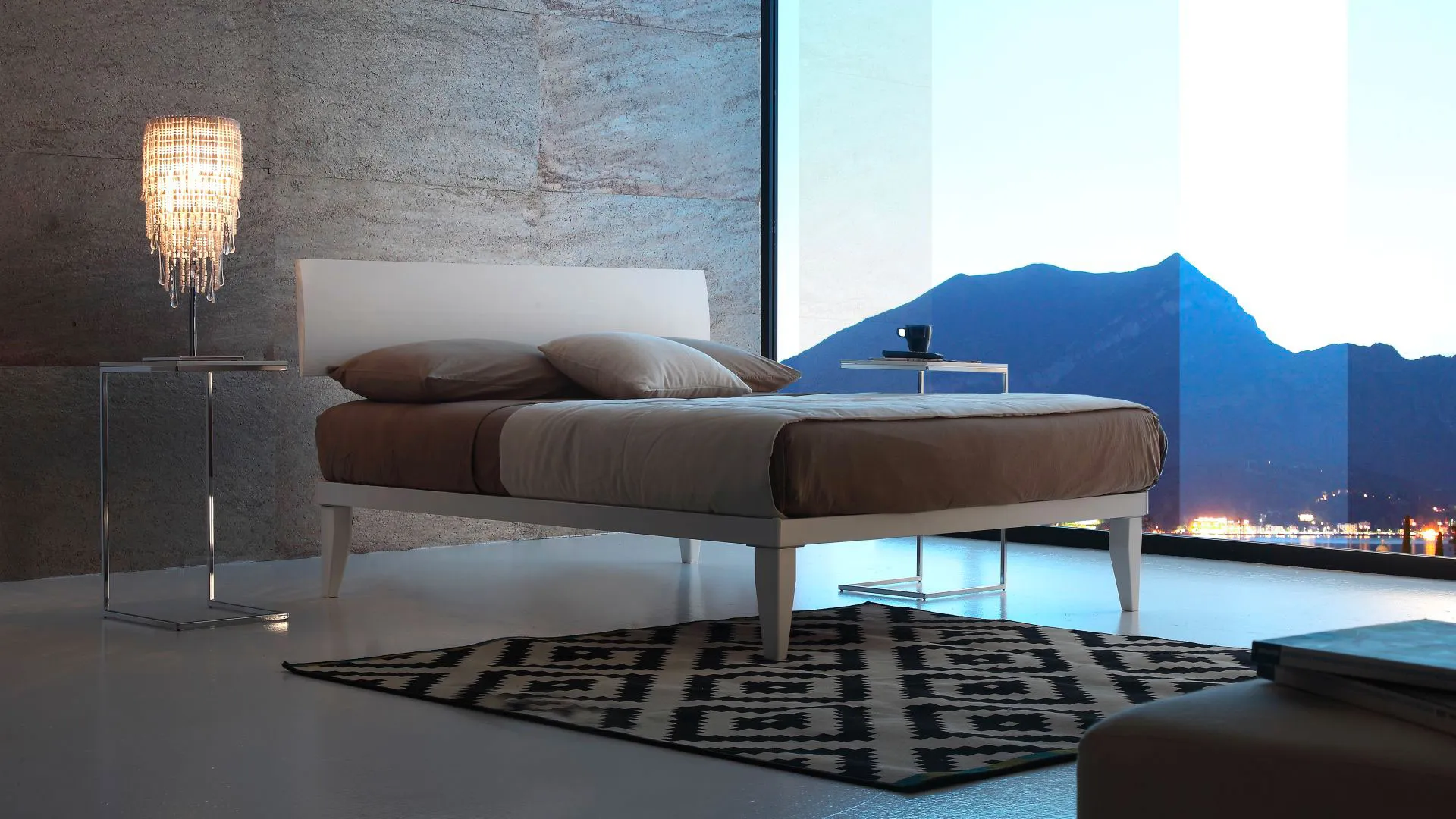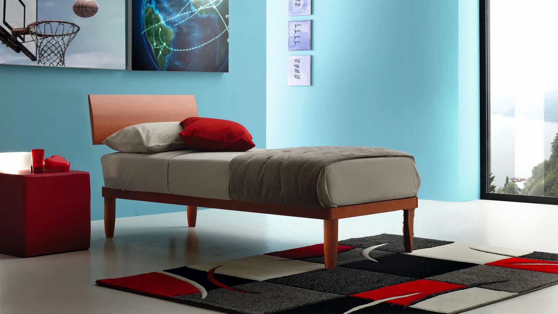 Modern bed with Niky headboard and sommier in White and Cherry melamine, available in both double and single versions.