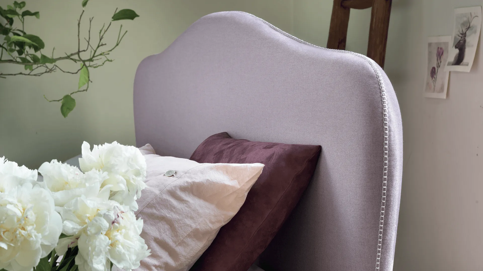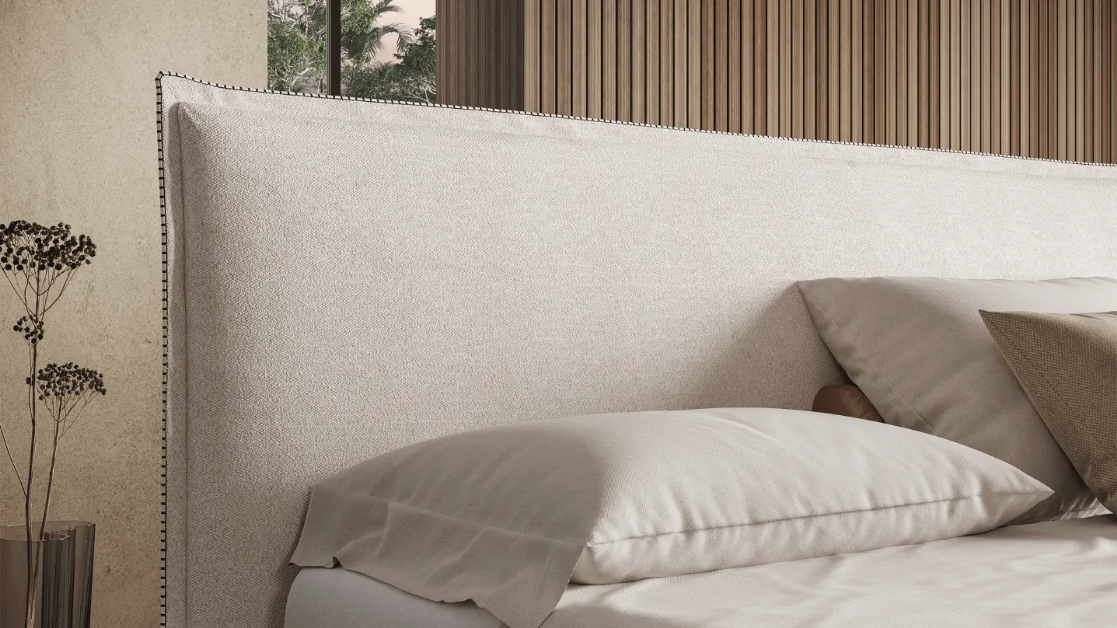 The double valance introduces a layered frame that enhances the design of the headboard and emphasizes its volumes.